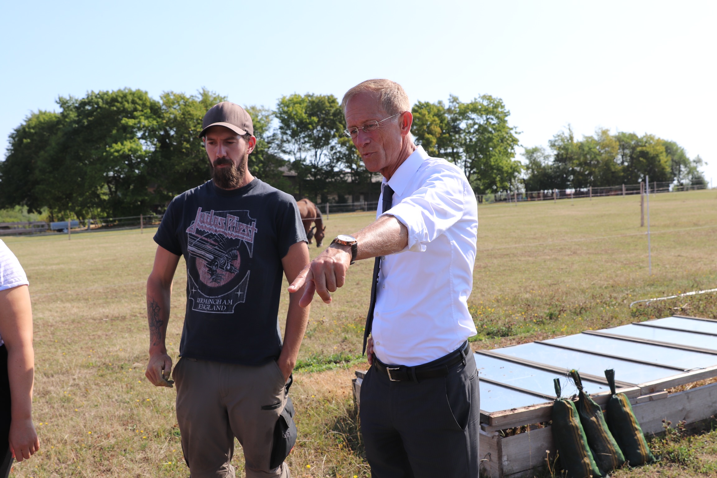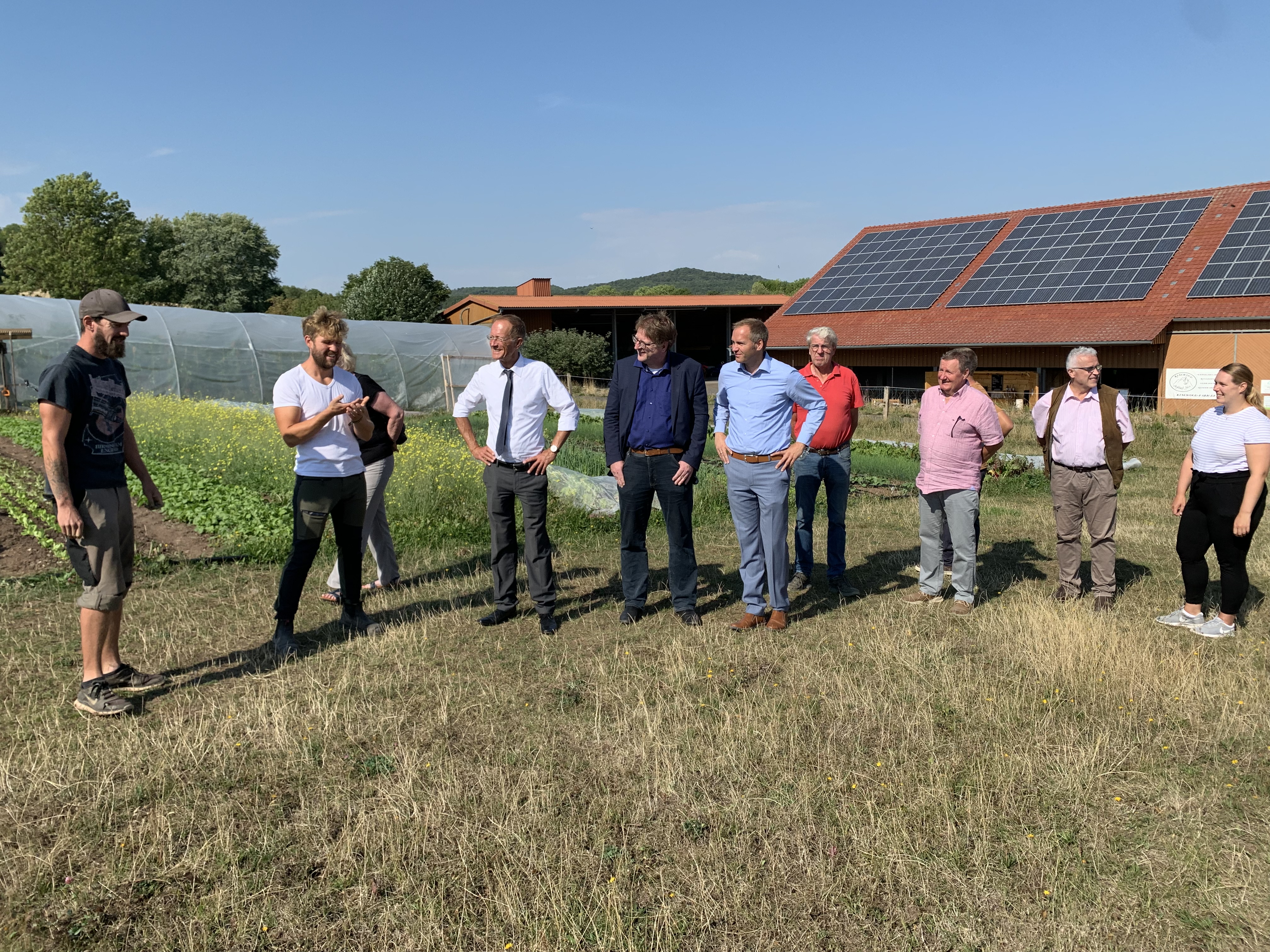 Der Chef der Staatskanzlei, Axel Wintermeyer (Mitte), hat das den Hof Tolle besucht. Betreiber des Hofs: Nils Tolle (8. v.l., Strategische Leitung, Projektplanung) und Marius Rau (9. V.l., Operative Leitung). Markus Müller (1. von rechts): verantwortlich für das Market Gardening Projekt.