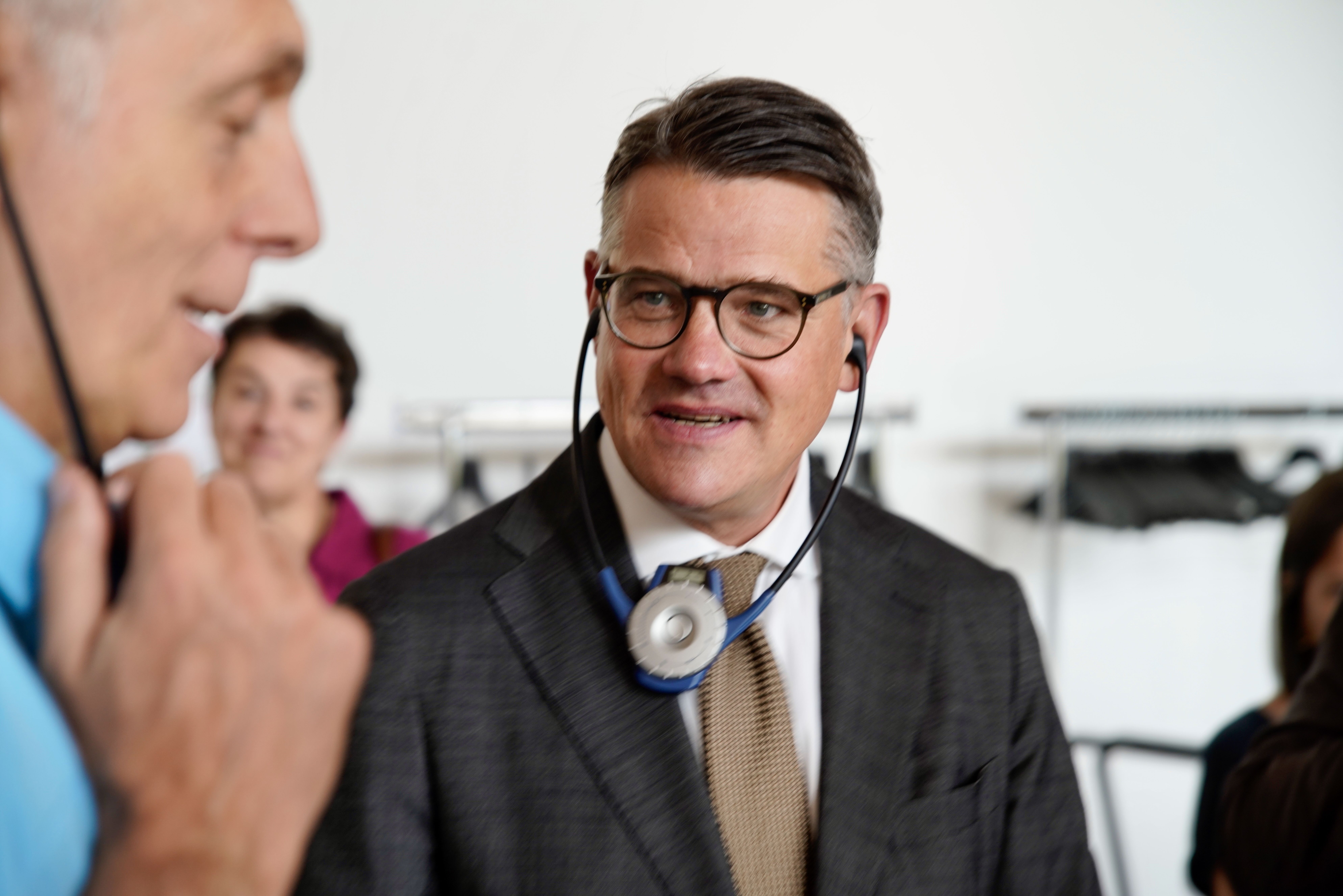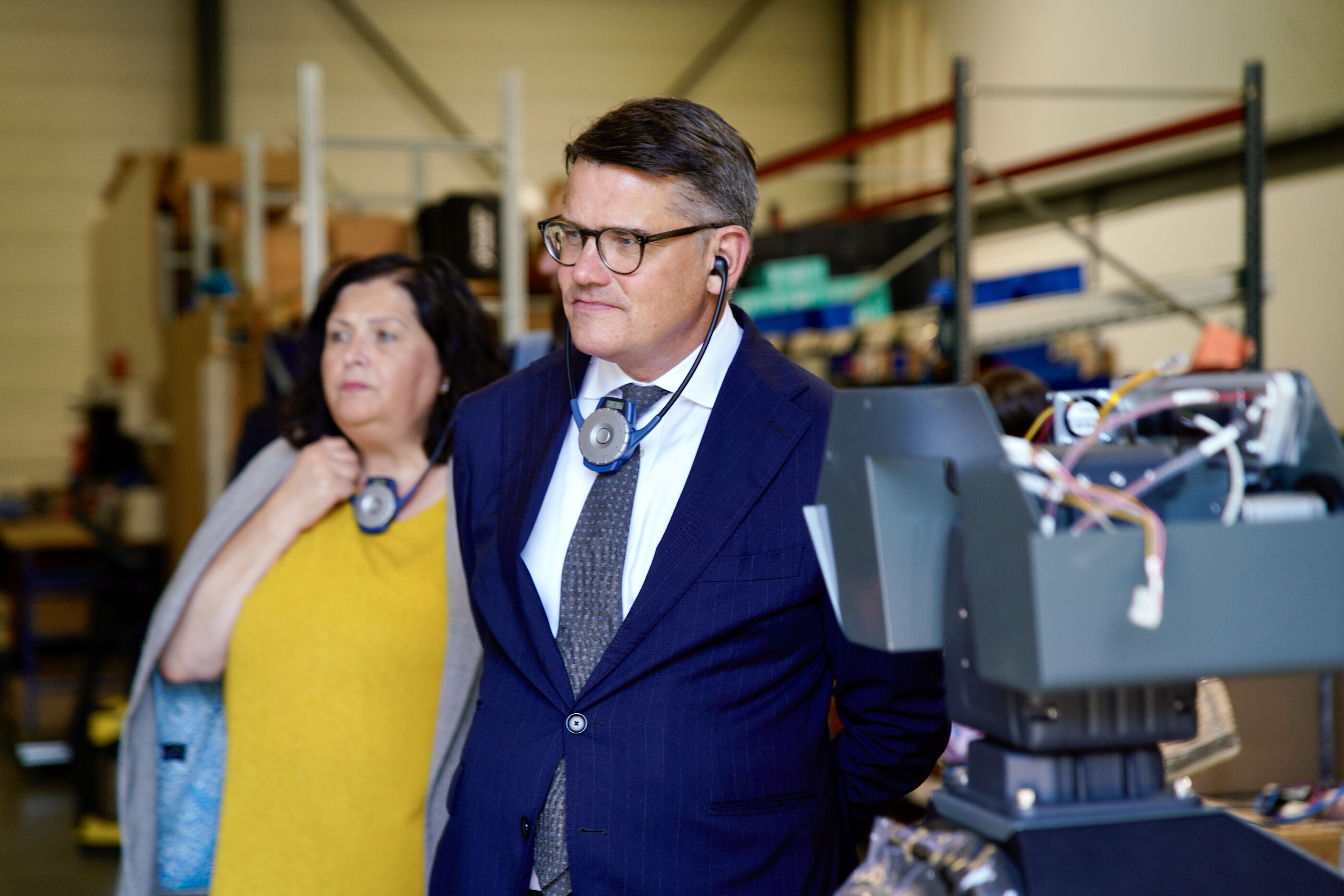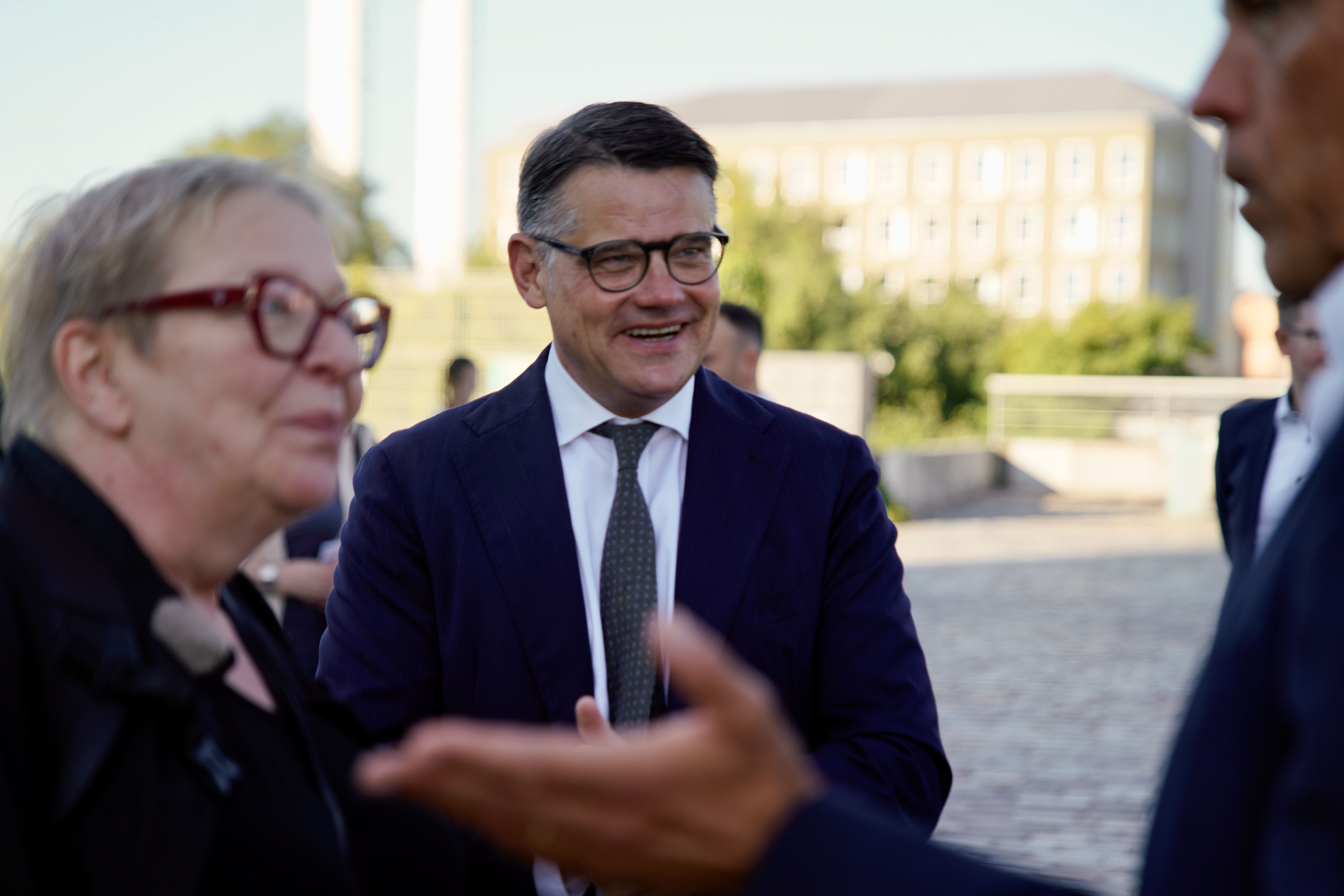 Ministerpräsident Rhein während der Gespräche im TechnoWest-Innovationspark. TechnoWest ist ein französisches Innovations- und Technologiezentrum, das sich auf die Förderung junger Unternehmen u.a. in den Bereichen Luft- und Raumfahrt, Verteidigung und Drohnentechnologie spezialisiert hat.
