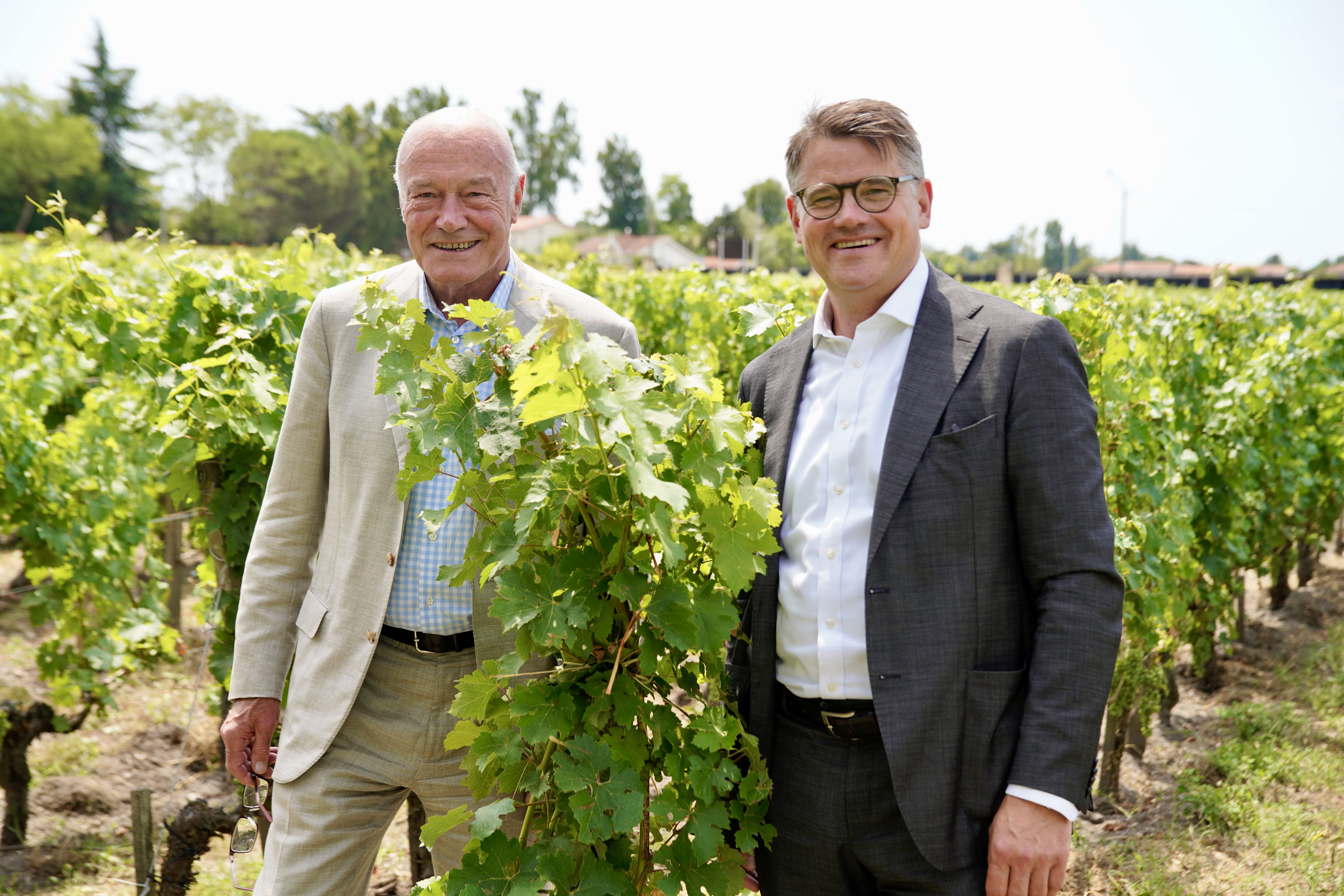 Regionalratspräsident Alain Rousset und Ministerpräsident Boris Rhein auf dem Weingut Château Pape Clément.