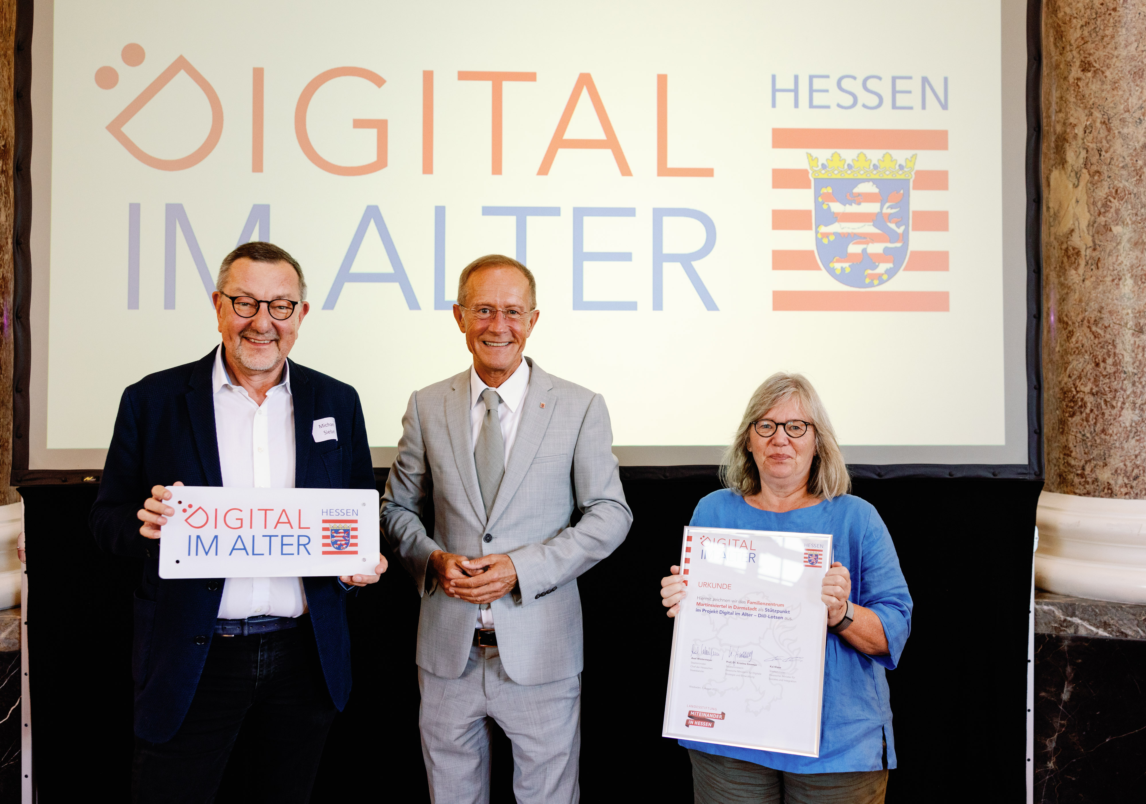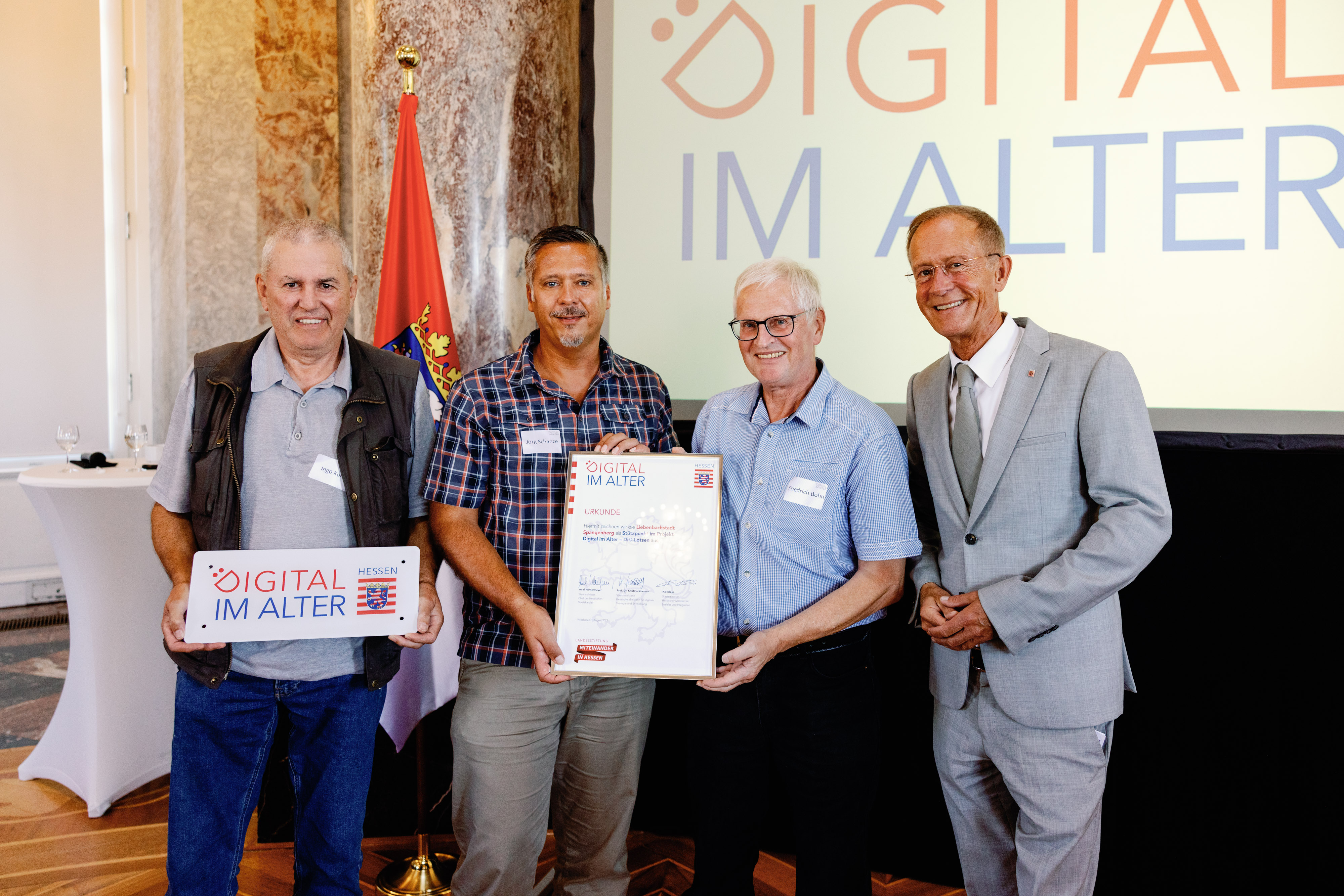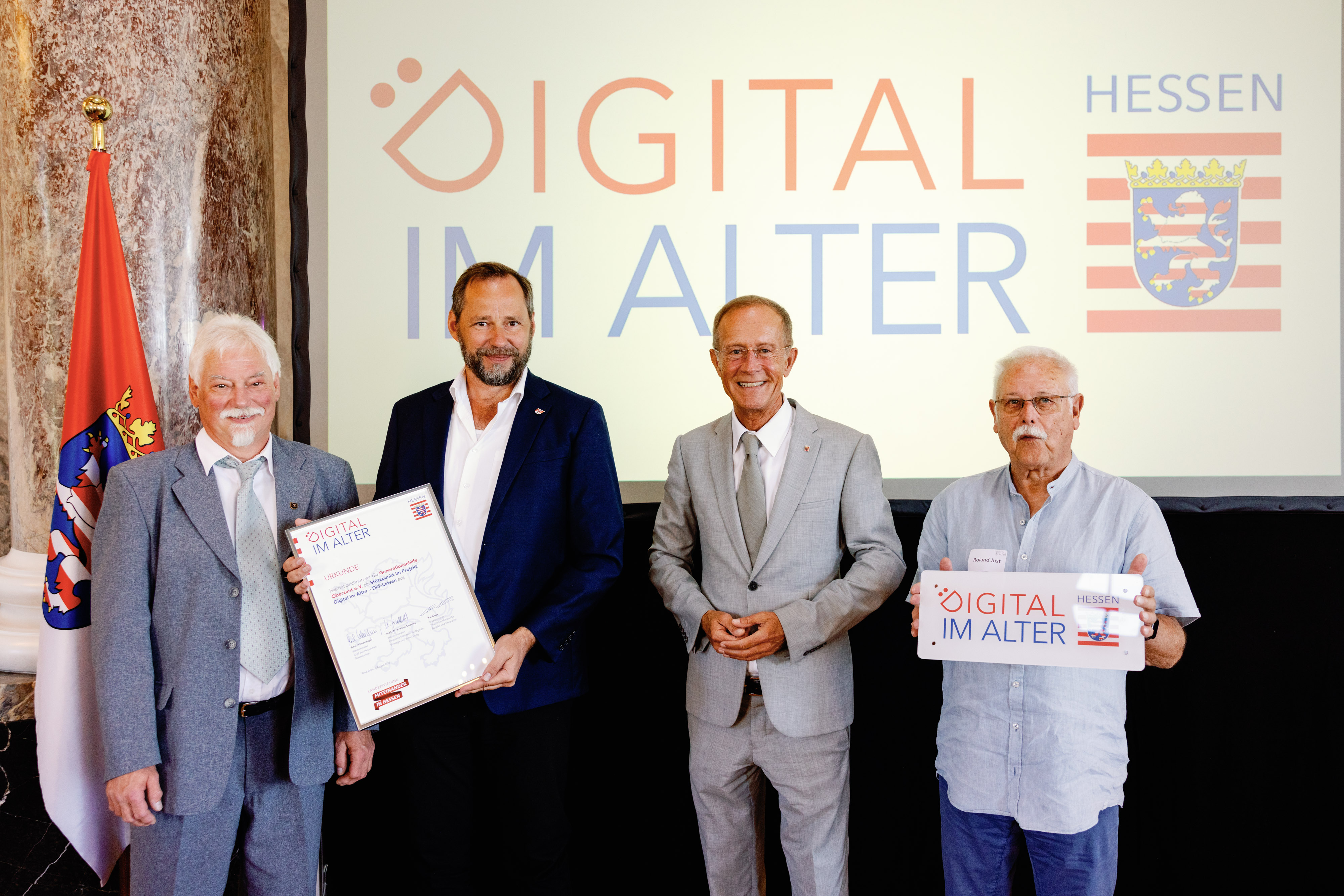 Der Chef der Hessischen Staatskanzlei, Staatsminister Axel Wintermeyer, hat die Generationenhilfe Oberzent e.V. beim 2. Di-Lotsen-Tag in Wiesbaden als Di@-Lotsen-Stützpunkt begrüßt und ihnen die Urkunde überreicht.