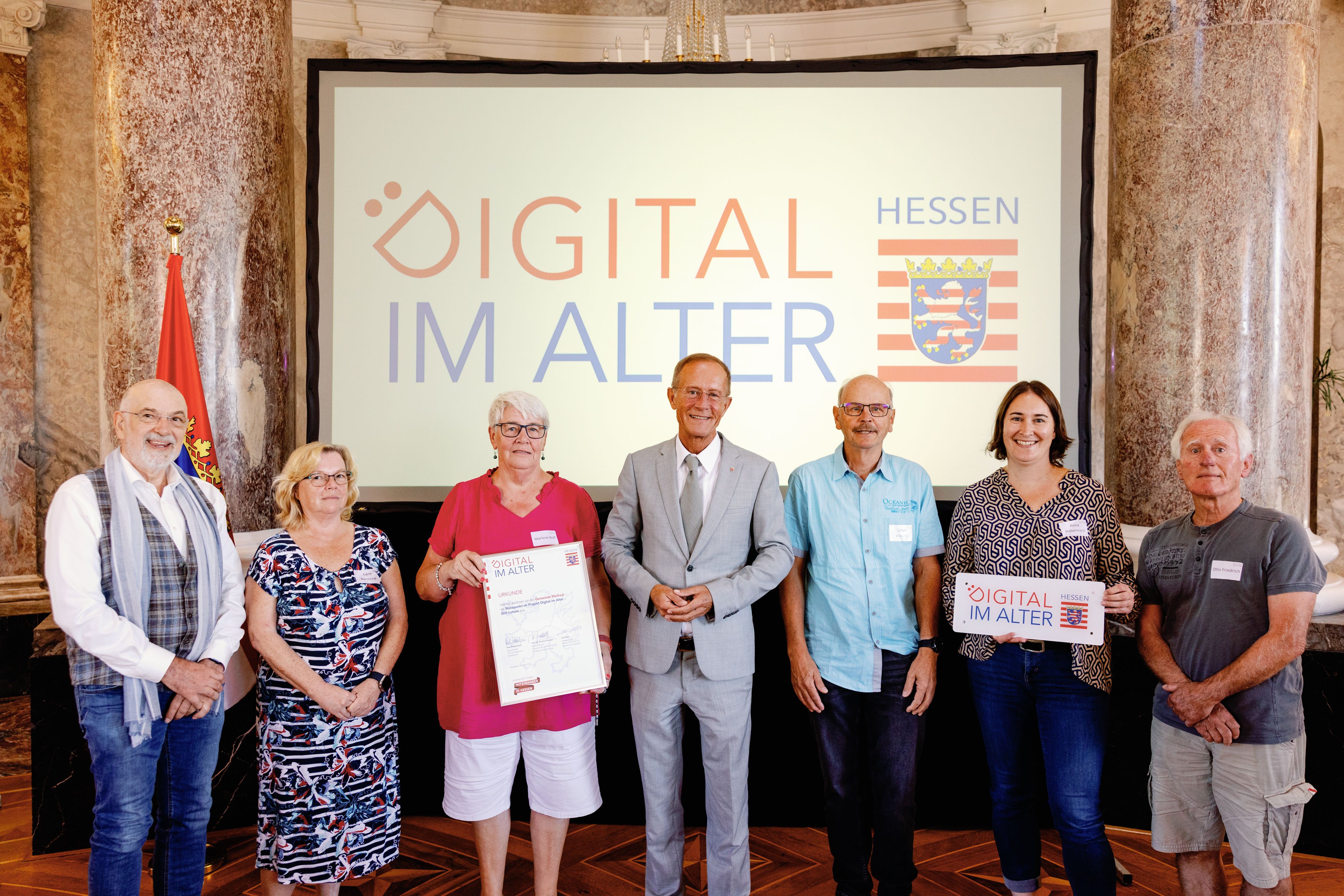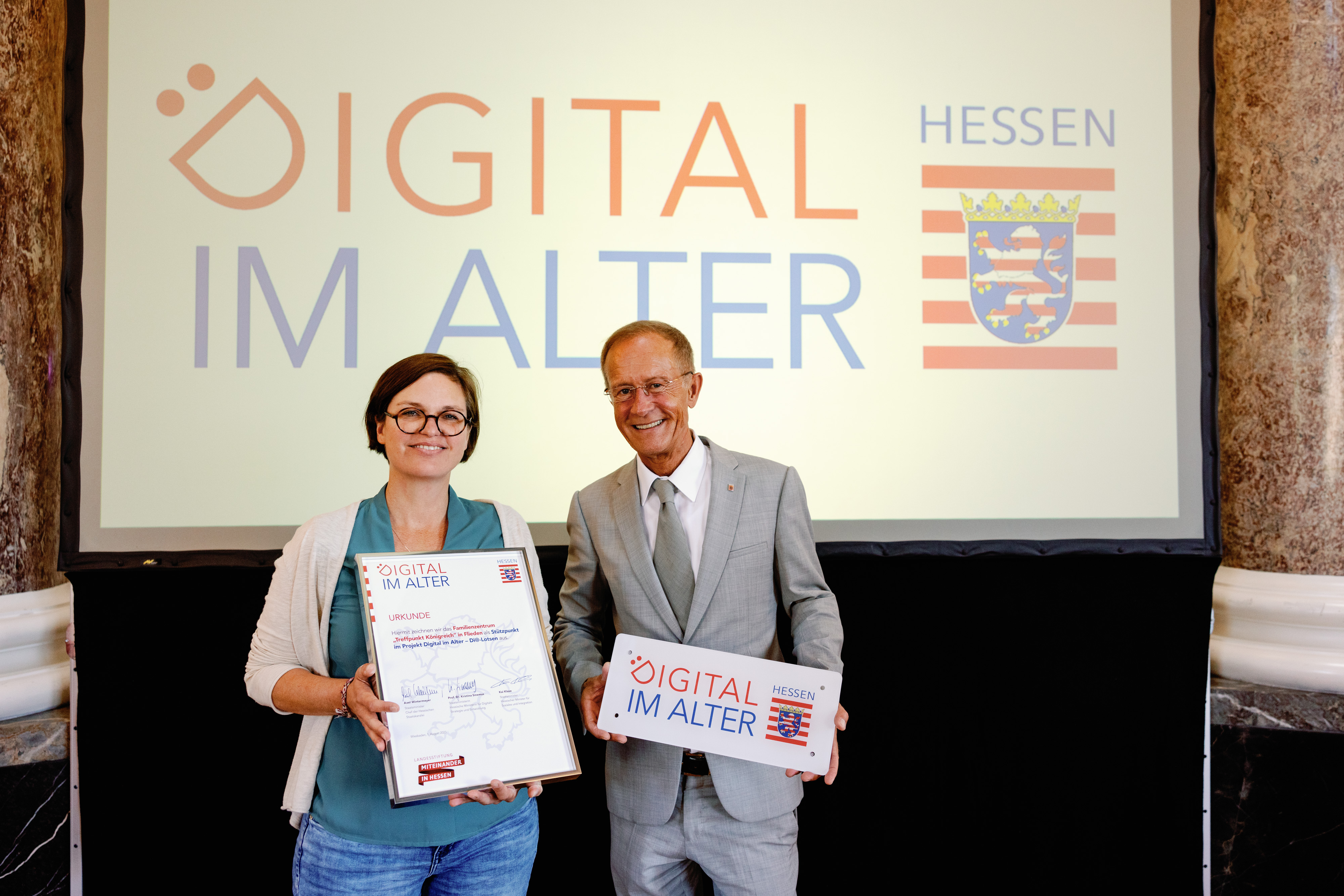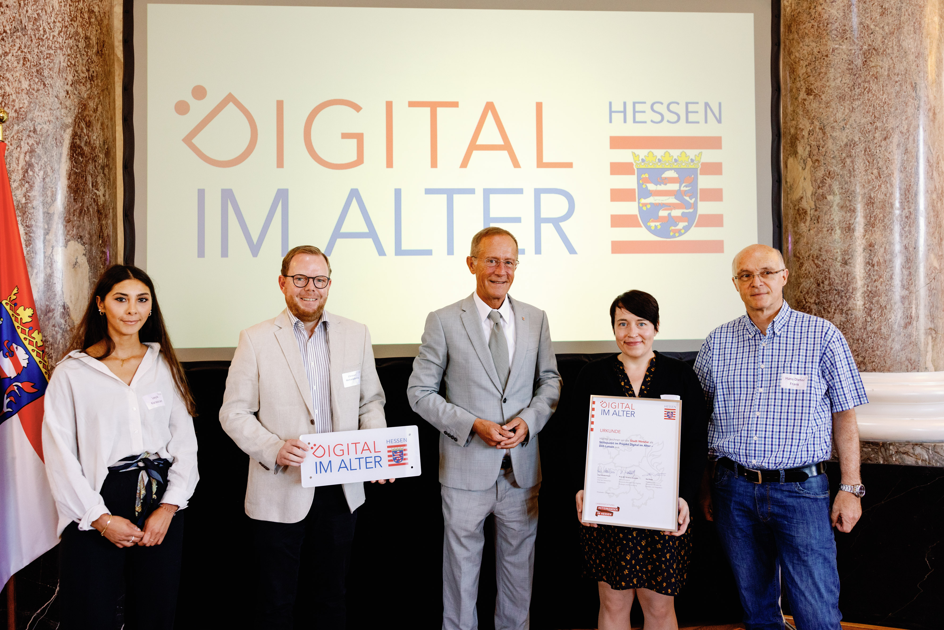 Der Chef der Hessischen Staatskanzlei, Staatsminister Axel Wintermeyer, hat die Generationenhilfe Oberzent e.V. beim 2. Di-Lotsen-Tag in Wiesbaden als Di@-Lotsen-Stützpunkt begrüßt und ihnen die Urkunde überreicht.