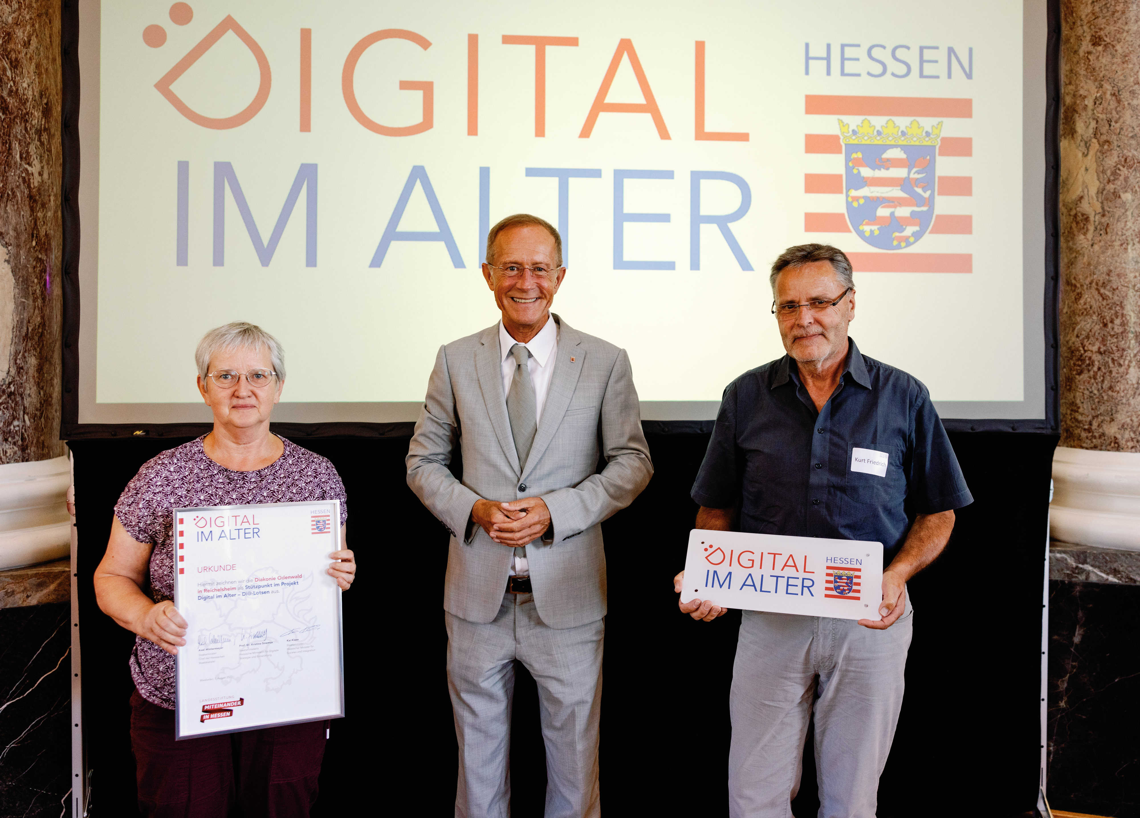 Der Chef der Hessischen Staatskanzlei, Staatsminister Axel Wintermeyer, hat die Diakonie Odenwald in Reichelsheim beim 2. Di-Lotsen-Tag in Wiesbaden als Di@-Lotsen-Stützpunkt begrüßt und ihnen die Urkunde überreicht.
